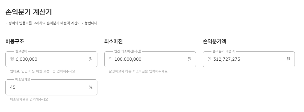 손익분기 계산기 화면